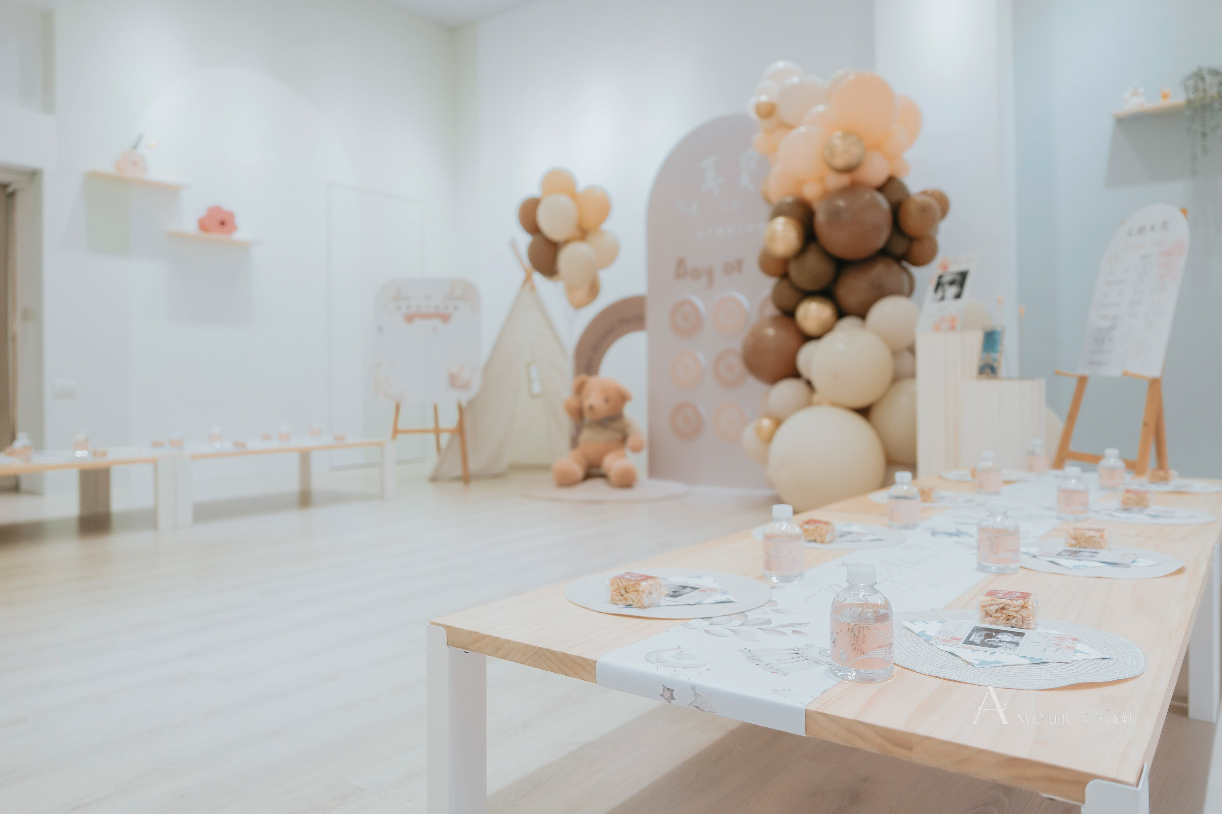 性別揭曉派對中最常見的款式,可客製化的部分為中間拍照牆、兩旁畫架上的板塊,以及氣球顏色。